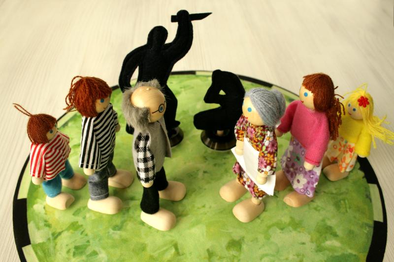 Затем мы вошли на «Чердак», где много говорили о ресурсах и силе Рода. С помощью семьи деревянных кукол и фетровых фигур-теней, в частности, человека с ножом и образа жертвы, мы проиграли историю бабушки. Разобрались в тайнах ее биографии и смогли провести разделительную черту между ее опытом и жизнью клиентки. Было рекомендовано попробовать выйти за пределы своего комфорта и продолжить реализовываться в любимой профессии. Исключить из своего гардероба длинные и мешковатые одежды!