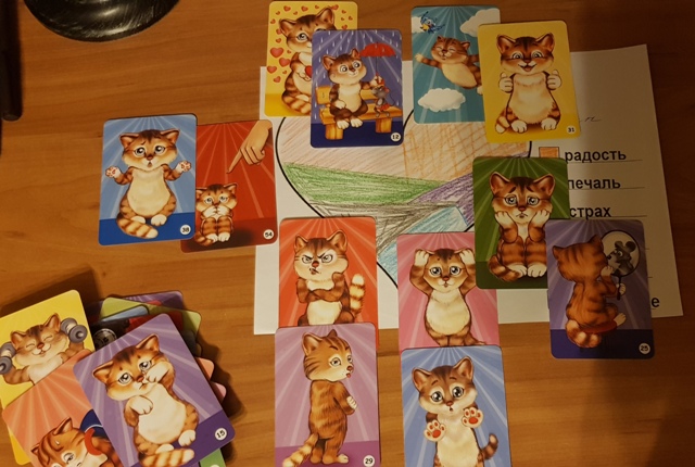 2.Когда наше сердце наполнено эмоциями, я показываю колоду карт «Котейка» - эта колода посвящена нашим эмоциям и чувствам. И прекрасно работает с любыми задачами, техниками и играми на эту тему. Она легко дает ответы на эмоциональное состояние и взрослых, и детей. Может служить и как самостоятельный инструмент работы, и как дополнение к любой технике.