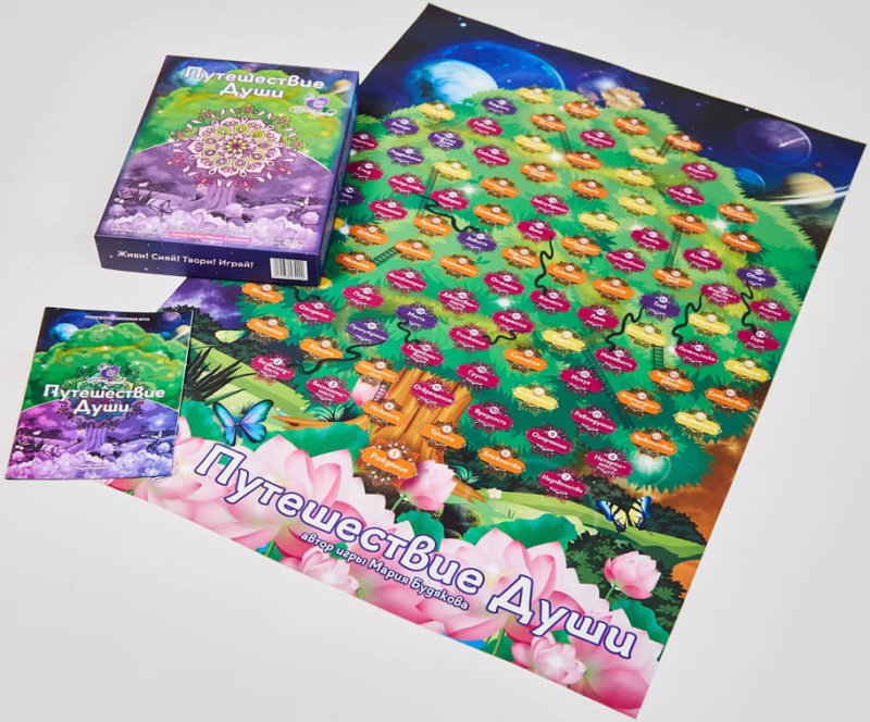 Игровое поле «Путешествия Души» – это Древо Души, представляющее собой мир самых разнообразных чувств, эмоций и состояний. Игра "Путешествие души" – это разговор с нашим подсознанием. Бросок кубика приводит игрока именно на те клетки, которые игроку необходимо осознать и проработать, чтобы вывести себя в новое ресурсное состояние. Игра подходит для работы с эмоциональным интеллектом.